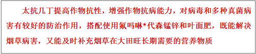 第二次用藥:太抗-幾丁30g+氟嗎啉*代森錳鋅30g+葉面肥25g兌水15kg噴霧煙株。(5月17日)